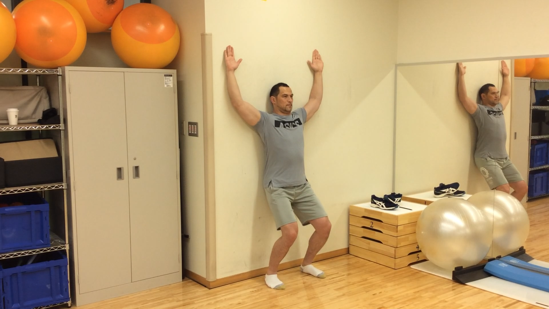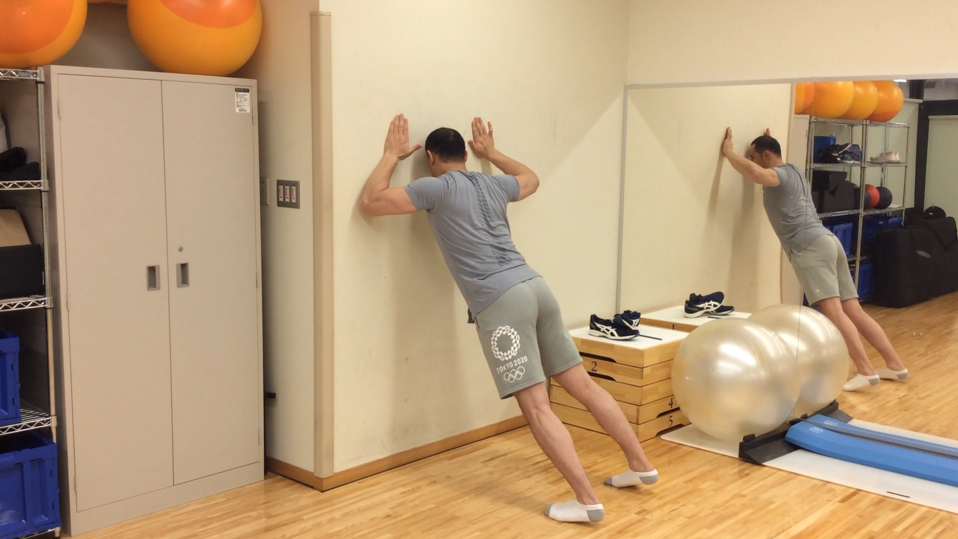 腕を壁につけたまま、身体を上げ下げする事で肩甲骨と肩周りの動きを引き出します。