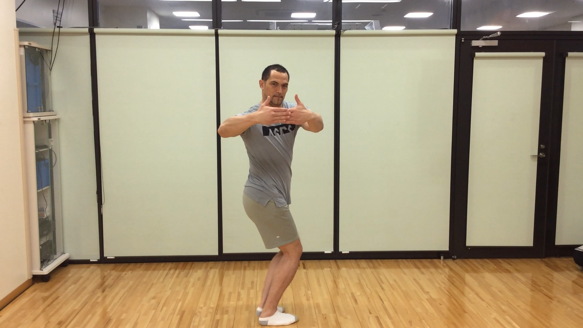 立位で全身の運動を感じながら股関節前面の筋群や脊柱の柔軟性の向上を目指します。