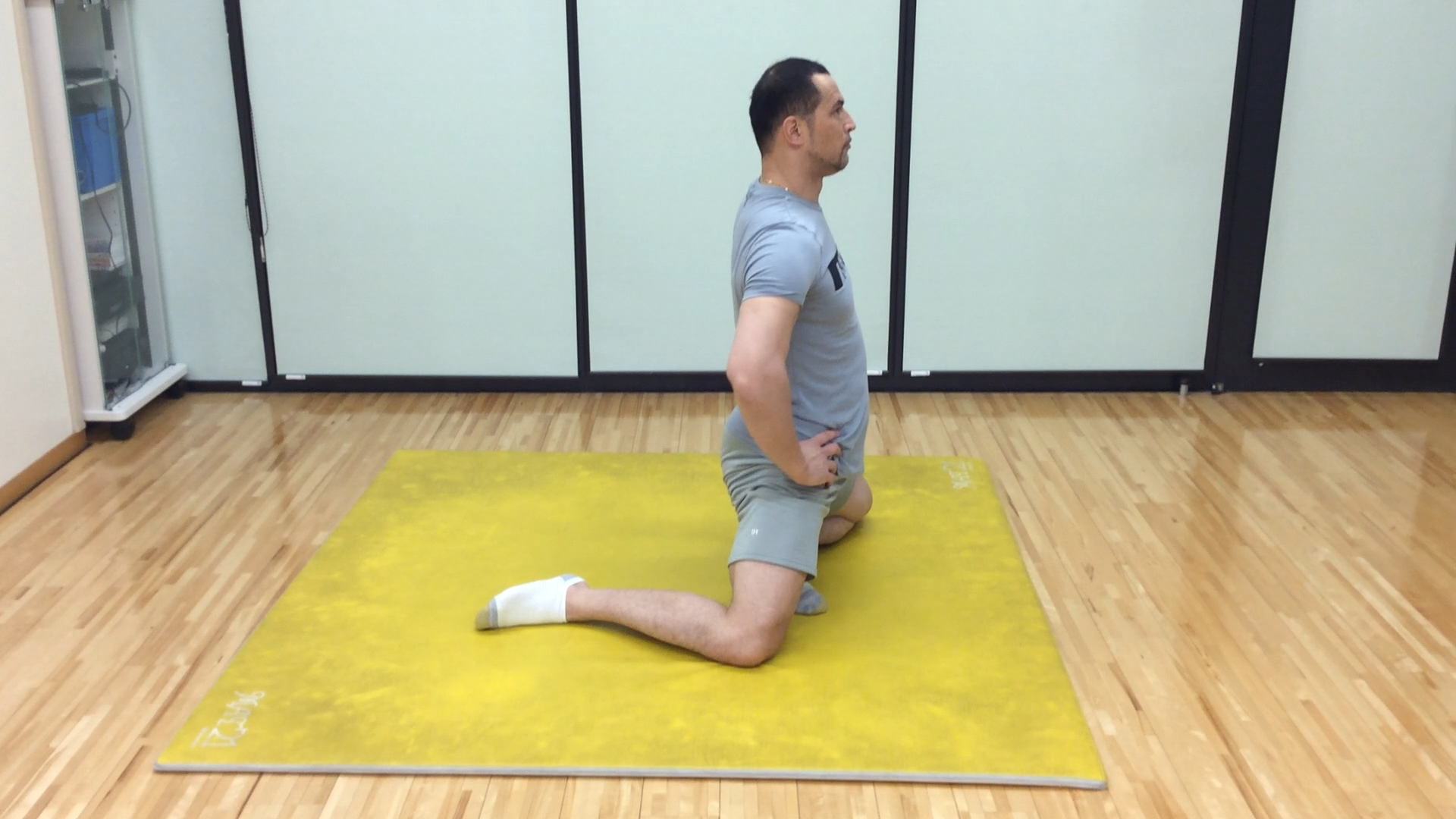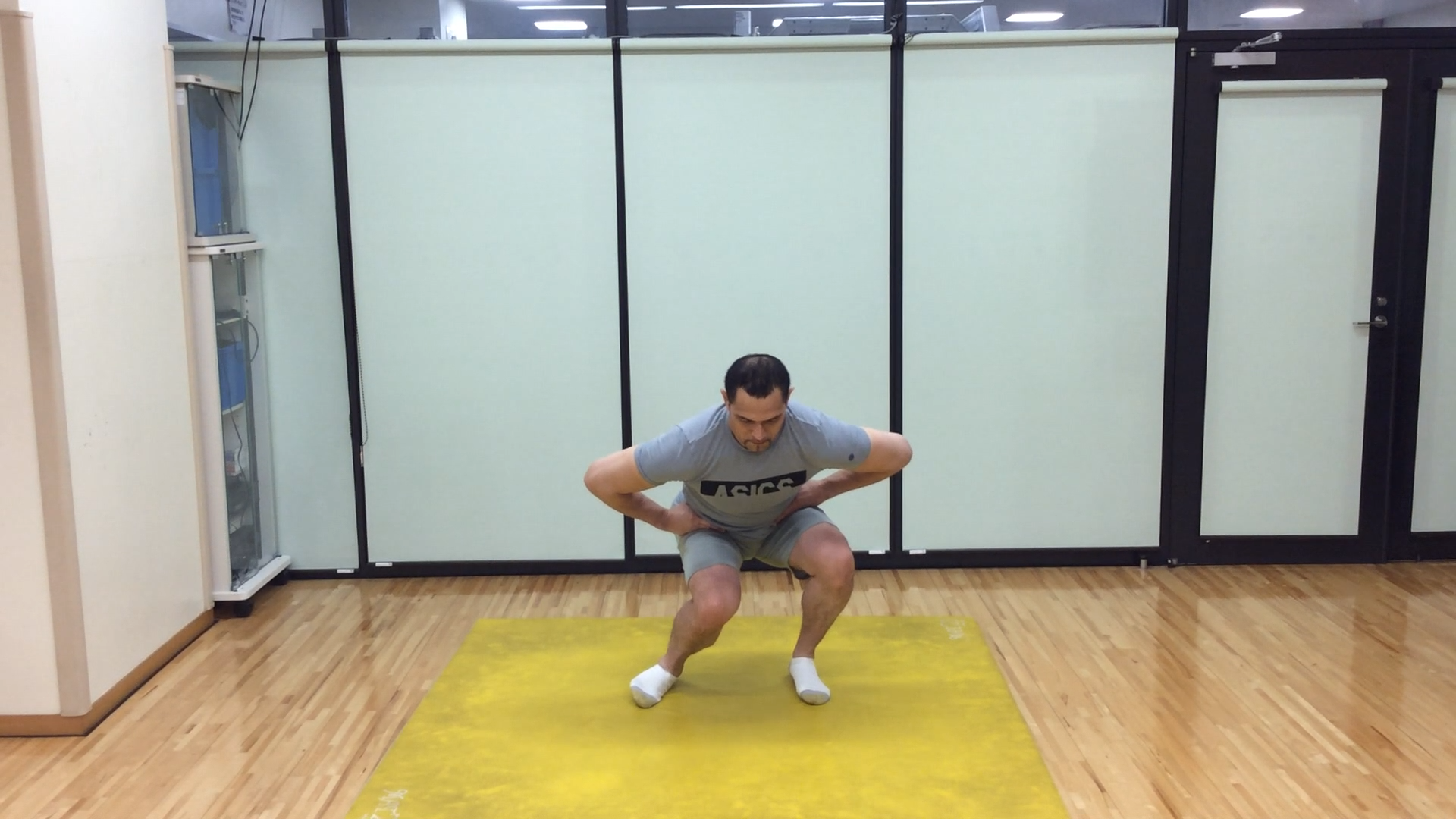 体重を側方に寄せた状態でのスクワット運動で股関節の動きを引き出します。